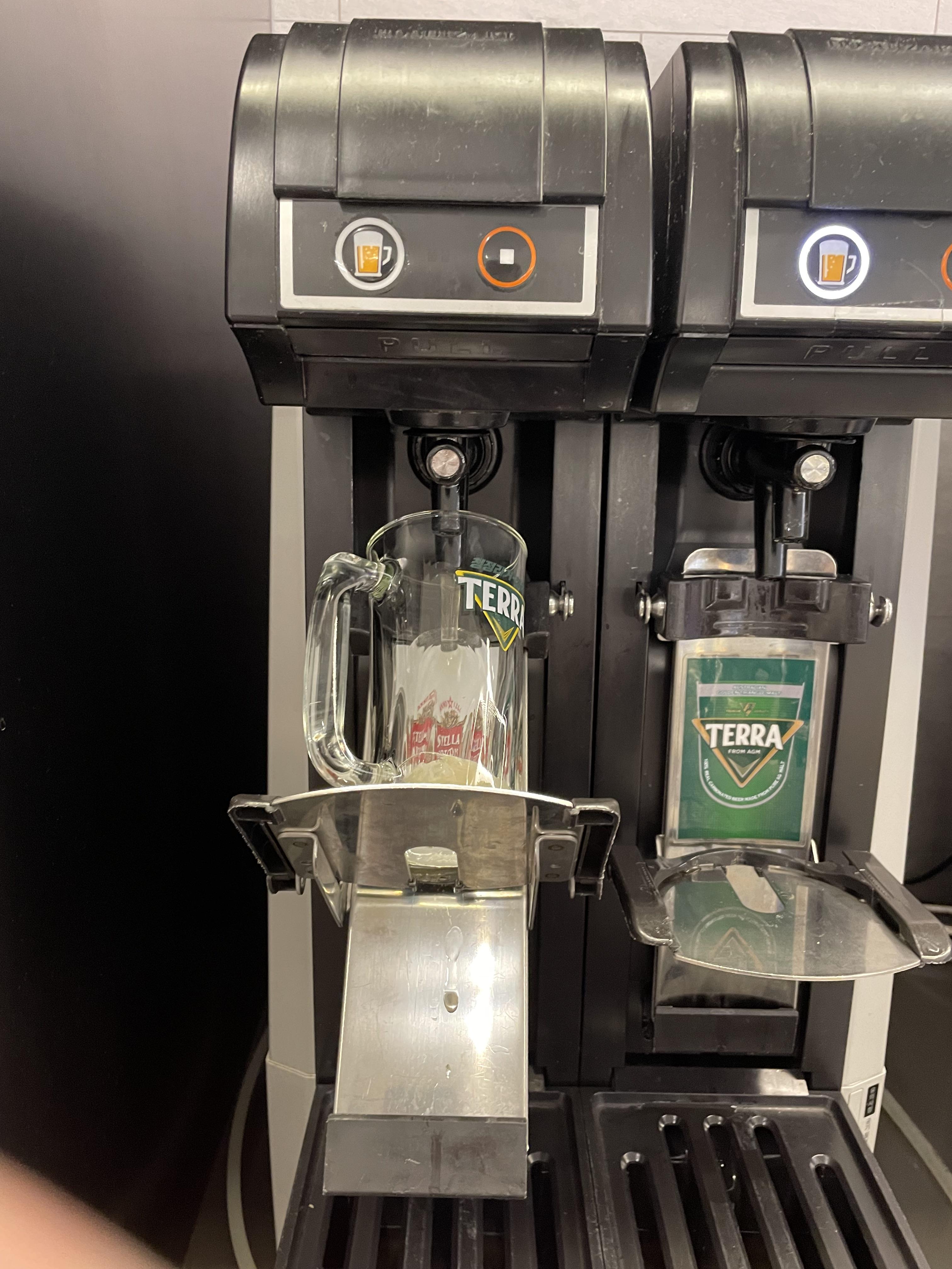 가자마자 맥주부터 한잔을 하는데 맥주를 자동으로 따라주는 기계가 있습니다.