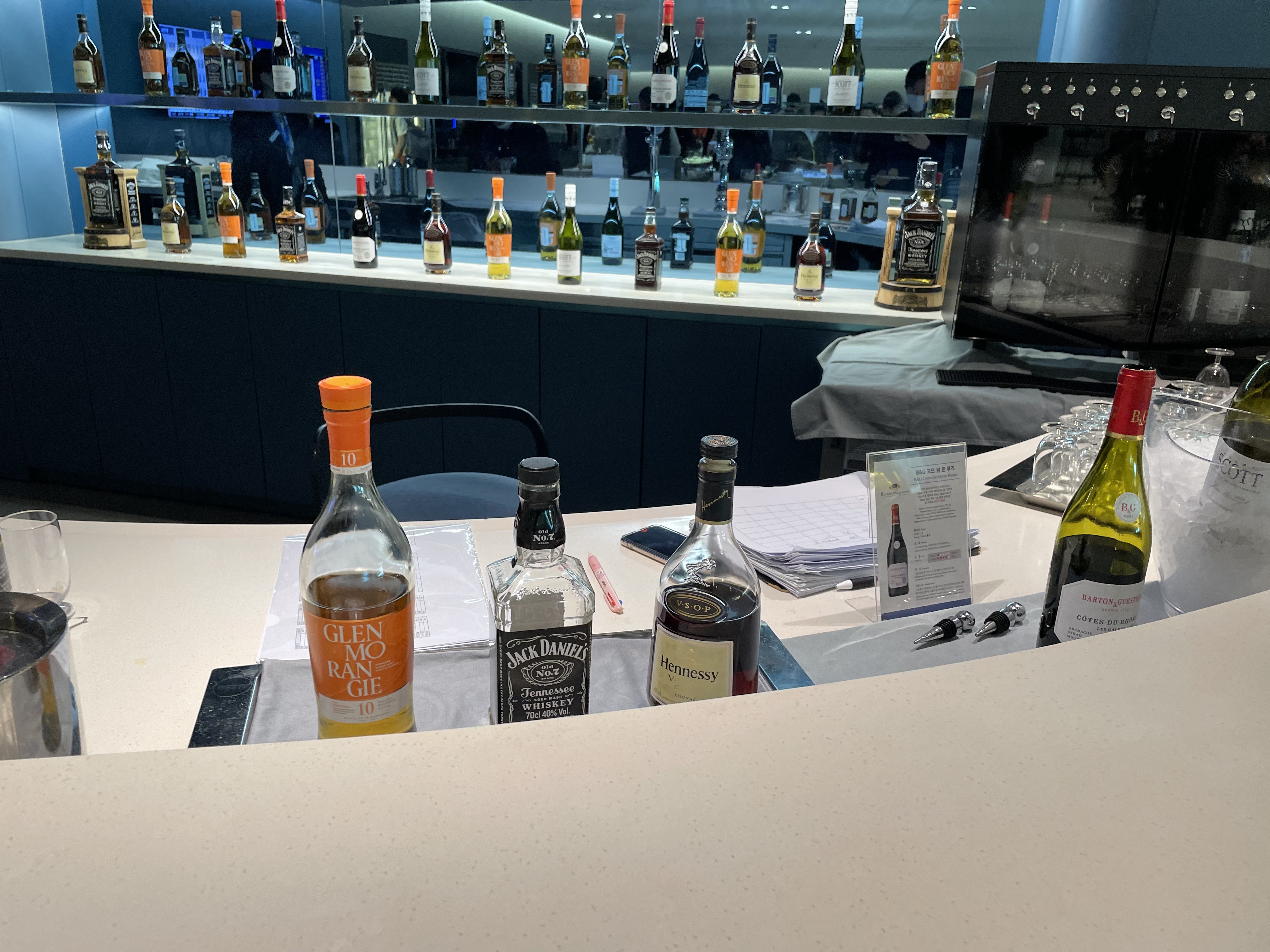 널찍한 공간에 간단히 요기할 수 있는 음식들과 주류가 준비되어 있어요.