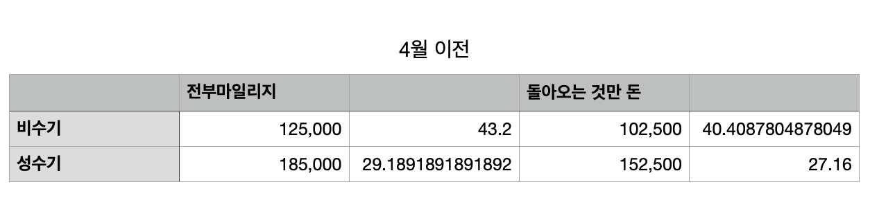 간단히 표로 보게 되면 전부 마일리지로 전환 시 비수기의 경우 12.5만 마일, 성수기의 경우 18.5만 마일리지가 나옵니다.